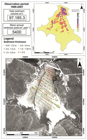 After about 18 years of dam activity, a bathymetric and seismo-acoustic survey was performed during a one-day field campaign in 1 September 2007, which allowed us to collect about 500 bathymetric points []. Horizontal control points have been extensively acquired by a Real Time Kinematic-Global Position System (RTK-GPS LEICA 1200 station whereas the elevation of the ground control point was referred to the estimated height of the reservoir water level. The amount of the sediment volumes stored in the dam was reconstructed on the basis of the comparison between the pre-existing topography and the sediment volumes estimated by the depth of the reservoir infill. Then, the reservoir sedimentation based on bathymetric and seismo-acoustic surveys was used in order to estimate the mean annual sediment deposition for the 1989–2007 period and a map of the sediment thickness has been created from the geostatistical interpolation of the collected bathymetric points []. Bathymetric survey was integrated by a geotechnical core drilling program [], which allowed us to define the sediment density useful to define the specific sediment yield.