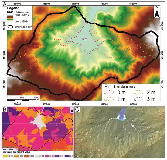 The Caesar–Lisflood LEM simulates landscape changes using a hydrological model to generate spatially distributed runoff, which is propagated on a regular grid of cells (i.e., the DEM of the study area) to estimate flow depths and velocities. This hydrodynamic model is used to modify elevations and estimates fluvial erosion and deposition within an active layer with peculiar grain-size features. Slope processes and soil creep are also included in the simulation []. In this work, the model has been used in the catchment mode with no internal influxes other than rainfall. The input data of the model includes DEM of the catchment, grain sizes, rainfall data, bedrock depth and value of Manning coefficient [].