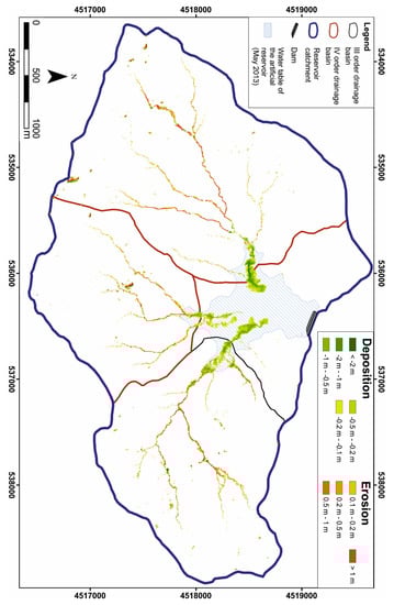Approximately 44.0% of the total amount of sediment eroded comes from the IV-order drainage basin (i.e drainage basin 2, Figure 8) whereas the smaller easternmost catchment contributes to the total sediment yield with a similar value (38%, drainage basin 4, Figure 8). Caesar–Lisflood simulation predicts topographic changes for an area of about 0.23 km2, which represent 2.3% of the total catchment area. Maximum depth of erosion is 3.8 m whereas erosion areas with a value ranging from 0.1 to 0.5 m are the prevalent class of the altitude difference map (i.e., about the 56% of the area affected by erosion, Figure 8).