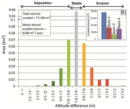 Histogram showing the distribution of the erosion/deposition classes deriving from the geographical information system (GIS)-supported analysis of the altitude difference map.