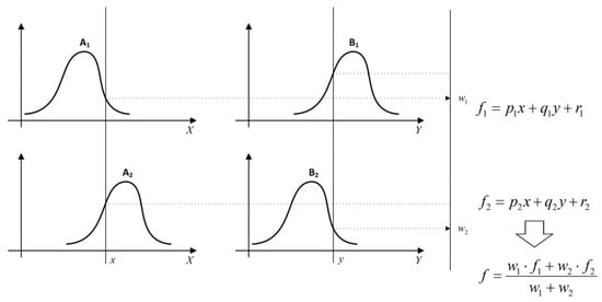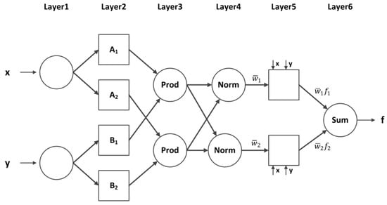where , and , are the MFs for inputs and , respectively, and , , and , , are the parameters of the output function. Figure 2 illustrates the fuzzy reasoning mechanism for this Takagi–Sugeno model to derive an output function () from a given input vector ( and . The structure of ANFIS consists of six layers (Figure 3) and the function of each layer is briefly described as follows: