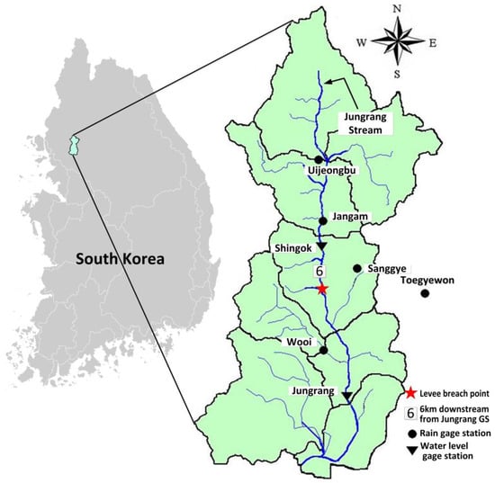 The models were applied to the Jungrang Stream in the Han River basin, South Korea. The Jungrang Stream is 296.04 km2 in watershed area, 34.8 km in length, 8.1 m in average width, and 1/1150 in average bed slope []. The study area and the location of gauge stations are shown in Figure 4. Water level data was obtained from two gauge stations located on the Jungrang Stream, and rainfall record data was obtained from five automatic weather stations (AWS) near the study area (Figure 4). Table 2 presents the seventeen rainfall events to examine the neuro-fuzzy system performance in the study area.