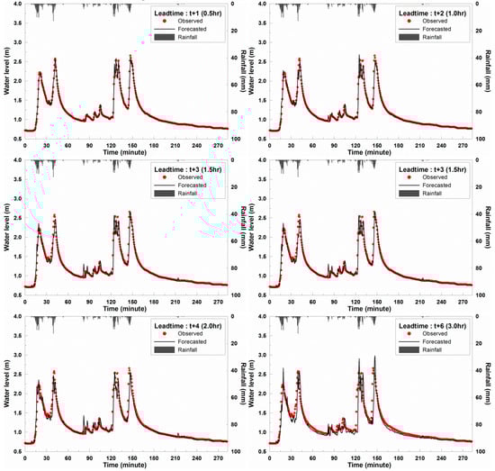 The selected M-3 ANFIS model was applied to thirteen rainfall events (excluding four events, applied to input vector selection, training, and checking) for the testing process, and flood forecasting for the six leading times (0.5, 1.0, 1.5, 2.0, 2.5, and 3.0 hour) was carried out for each event in the Jungrang gauge station (GS). Figure 6 shows a comparison of the forecasted water level and observation for each lead time of J-11 event. Among the thirteen rainfall events applied in this study, only the J-11 event (related to Section 4.3) that resulted in urban flooding due to levee breach was illustrated. As shown in Figure 6, the forecasts were well matched with observations up to 2.0 hour lead time. At the lead times of 2.5 and 3.0 hour, the two values (forecasts and observations) were in agreement with each other overall, but the forecasts are slightly delayed from the observations at the part where the water level is rising. In the case of the peak water level, the forecasts and observations were almost identical until the 2.0 hour leading time, but the forecasts were somewhat higher than the observations at the leading times of 2.5 and 3.0 hour.