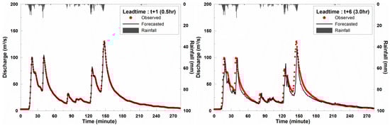Figure 7 presents the converted discharge for t+1 (0.5 hour) and t+6 (3.0 hour) among six lead times in the J-11 event at Shingok GS. This figure also shows a comparison of the two discharges converted from the observed and forecasted water level at Shingok GS. The forecasted discharge (Figure 7) and water level (Figure 6) were applied to 1-D hydrodynamic model as the upstream and downstream boundary conditions, respectively. The model performance indices for the ANFIS testing process at Shingok gauge station are shown in Table 5. As shown in Table 5, it showed better results than the Jungrang gauge station.