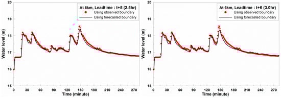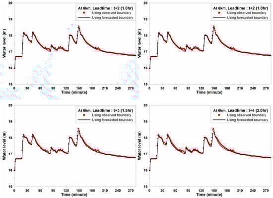 Comparison of predicted water level using observed and forecasted boundary conditions at a distance of 6 km downstream from Jungrang GS for each lead time (J-11 event).