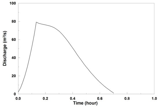 The 20-m wide left-hand side levee placed around 9 km downstream from Shingok GS (Figure 4) partially failed through a half hour duration of a J-11 event []. This levee breach led to flooding in part of the study area and Figure 9 presents the estimated levee breach discharge from 1-D river modeling with neuro-fuzzy model. The applicability of the 2-D flood inundation model linked to 1-D river modeling using the neuro-fuzzy model was tested in this area. That is, the estimated levee breach discharge (Figure 9) based on breach width and duration was applied to 2-D flood model as a boundary condition for flood inundation analysis in the study area.
