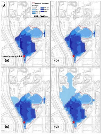 where and are the estimated and observed flood extent area, respectively. The symbols and represent the intersection and union of two domains, respectively. The value of equals to 1 when two domains match perfectly, and 0 when no intersection area []. Wadey et al. [] evaluated the fit () as three parts; good fit (>0.75), moderate fit (0.50~0.75), and poor fit (<0.50).