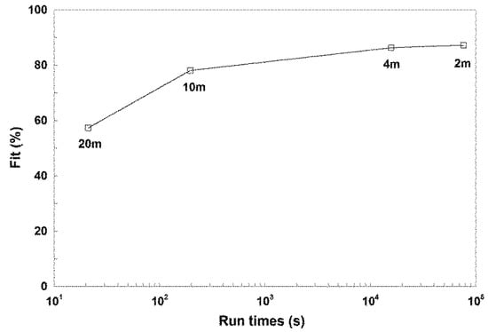 On the other hand, at the lowest grid resolution (20 m), the run time was the fastest (3 s) but the accuracy was the lowest (<57%). The accuracy was about 10% degraded and run time was almost two orders of magnitude faster in 10 m grid size than those of 4 m grid size. In the 20 m grid size, the accuracy was degraded by 27% and the model was executed just an order of magnitude faster compared with the 10 m grid size. The slope of the computational efficiency (fit vs. run time) of the model according to grid size shown in Figure 11 represented a significant change at the resolution of 10 m. This result indicates that 10 m grid resolution is a more realistic option with respect to real-time inundation analysis considering model run time and accuracy (78% and 192 s) with good fit condition (>75%) of Wadey et al. []. Although this simulation was performed on a home-use computer, if a high-performance computer or parallel computing including OpenMP (Open Multi-Processing) and MPI (Message Passing Interface) is used for flood inundation analysis, it is expected that more accurate results could be provided in real time.
