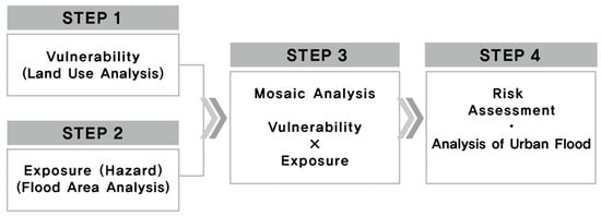 The basic ideas and concepts are shown above. The vulnerability analysis was carried out based on urban space characteristics and building characteristics, including non-structural characteristics, by setting 100 m × 100 m geographic grids as the evaluation units alongside urban flooding analysis based on environmental factors such as topographical characteristics and rainfall characteristics. The urban flood risk was assessed and analyzed based on these results and using the risk mapping technique. Concepts and processes important to their construction are described herein and in Figure 2.