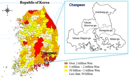 The distribution of flood damage in Korea analyzed by the Korea Ministry of Land, Infrastructure, and Transport is shown in Figure 3 [37], and Changwon City is selected as the target area due to its advantages of data construction because it includes areas with both high and low flood damage [31].
