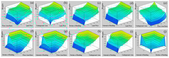 Flood damage scheme: (a) land price—floor area ratio, (b) land price—underground area, (c) land price—decline of building, (d) land price—material of building, (e) floor area ratio—underground area, (f) floor area ratio—decline of building, (g) floor area ratio—material of building, (h) underground area—decline of building, (i) underground area—material of building, and (j) decline of building—material of building.