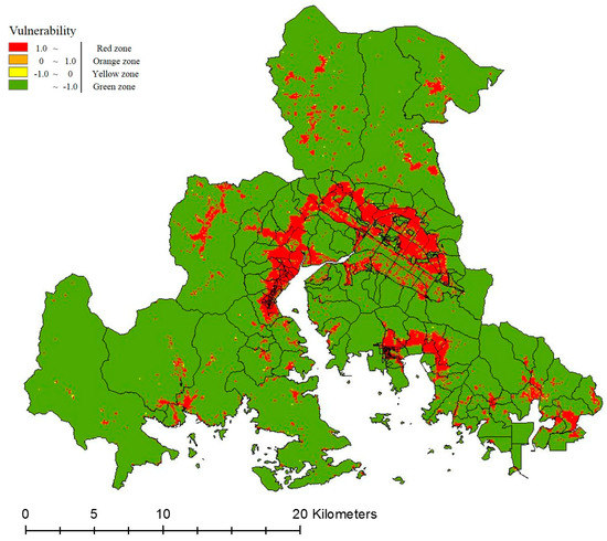 Once the vulnerability grade for land use has been determined based on standardization of the fuzzy score, it is possible to classify based on the level of risk. The standard color was determined by designating the area with the highest vulnerability as the red zone, the area with high vulnerability as the orange zone, the area with intermediate vulnerability as the yellow zone, and the area with low vulnerability as the green zone. If the resulting values are applied to the map of Changwon, it is possible to derive the land use classification map, as shown in Figure 5.
