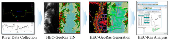The analysis using HEC-Ras is a typical flood analysis model that conducts a simulation by constructing the river crossing data, the center line of the river, the river bank line, and and using the flood amount and the flood level as the boundary conditions. This analysis process is shown in Figure 6.