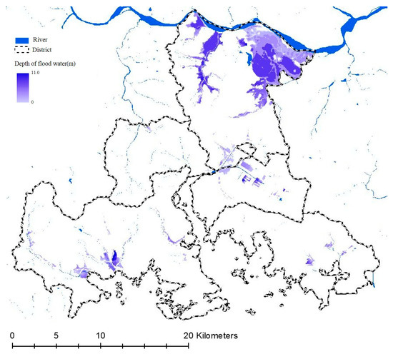 The urban flood map prepared by using the one-dimensional model HEC-Ras based on the basic environmental factors such as rainfall data and topographical data developed by the Ministry of Interior and Safety was used in this study [45]. The urban flood map is shown in Figure 7 below. The urban flooding area evaluation confirmed that the flood depth was high in the northern area adjacent to the river and reservoir and also high in the areas adjacent to Changwon City Hall, which play key roles in Changwon City and are also considered as the town center.