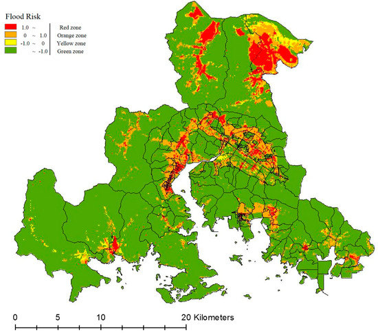 The analysis of urban flood risk confirmed that the red zone was mainly found in the central commercial area, where various infrastructures, including public institutions that play key functions in the city, are located. This appears to be related to the development considering the economy, convenience, and efficiency of the city. The orange zone shows a fan-shaped distribution centering on the red zone, which also demonstrates the tendency of branching out from major functions and socio-economic parts of the city, and by use area, they were classified into distribution commercial areas, including general commercial areas and quasi-residential areas. The distribution of the yellow zone centered on the residential area confirms that it is distributed in the area that was formed a long time ago. It is considered that this is closely related to the aging of buildings. The green zone was mainly distributed in green areas where the environmental values or the environment rather than the value of development land use need to be preserved.