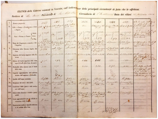 Ancient rain water harvesting systems (veras) in Venice have been counted by Reference [9] (Figure 1, shows two pages of an old census), and a number of photographic data collection is available online (e.g., Reference [10]). Now that the veras are not in use anymore, they are hidden, disregarded, and often overlooked by tourists. Rehabilitation of ancient veras would match the need for conservation of precious water resources and cultural heritage, celebrating and adding value to historic environments.