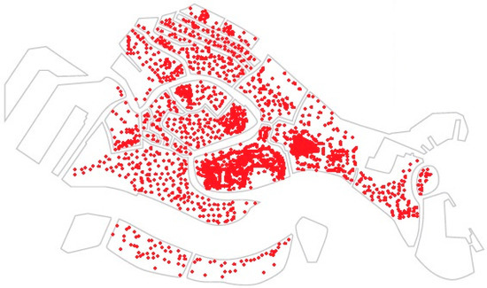 Spatial distribution of ancient cisterns in Venice (red symbols).
