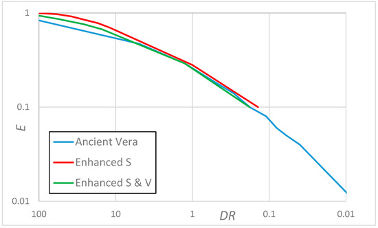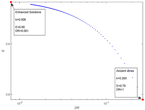 where . Results obtained for the ancient vera draining water from campiello only and the two enhanced solutions are shown with red dots. The two enhanced solutions are in the range of low DR achieving efficiency values close to E = 0.99.