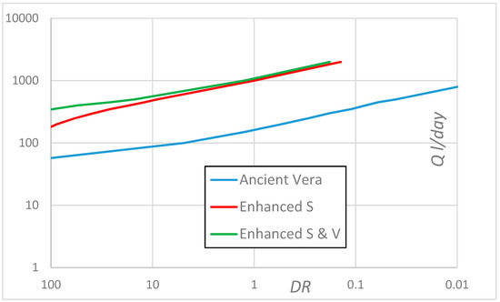 In Figure 5, the relation between demand ratio DR and water demand is indicated for the three technical solution analyzed here: The typical ancient veras draining water from campiello only and the two enhanced solutions.