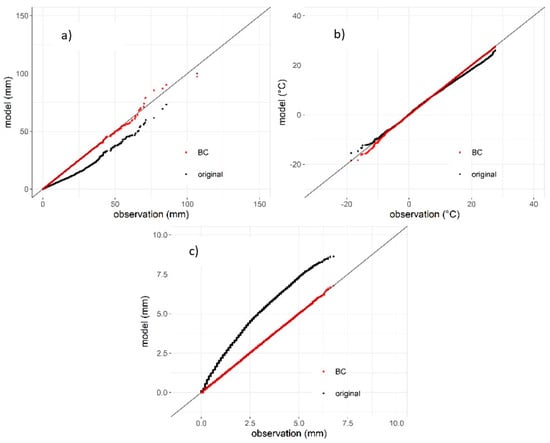 Quantile-quantile (Q-Q) plots of observations against model data for the precipitation (a), air temperature (b), and evapotranspiration (c) data during the reference period, 1981–2010, for the grid cell which contains a Ljubljana-Bežigrad meteorological station. Red dots represent bias-corrected (BC) data, black dots represent raw model data. BC values adjust better to observations than raw model data. It should be noted that we did not apply BC on station values, but on interpolated values in the model grid.