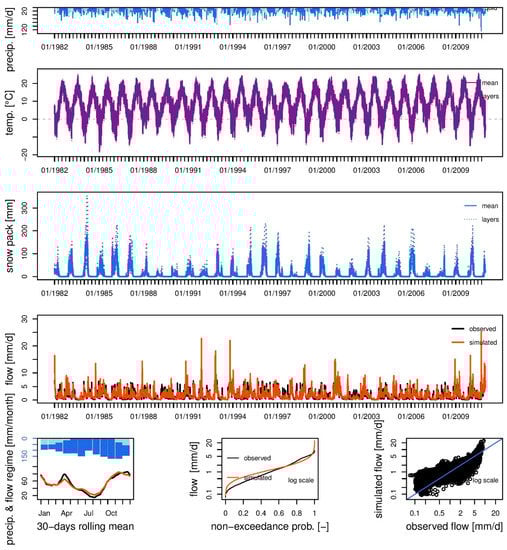 Hydrological modelling results using the CemaNeige GR6J model for the Vrhnika station on the Ljubljanica River for the calibration period (1982–2010; 1981 is used for model warm-up).