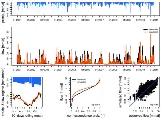 Hydrological modelling results using the GR6J model for the Mali Otok station on the Nanoščica River for the calibration period (2001–2010; 2000 is used for model warm-up).