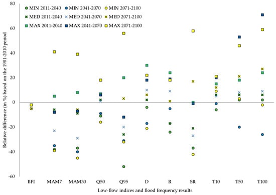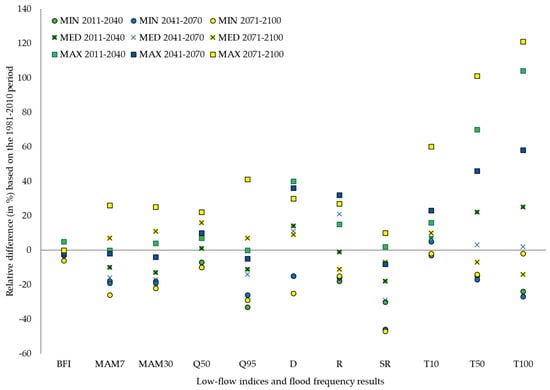 Low-flow indices and flood frequency results (T10, T50, T100 are discharge with a 10, 50, and 100-year return period, respectively) for the periods of 2011–2040, 2041–2070, and 2071–2100 for the Mali otok gauging station (Nanoščica River). All values are given as a relative difference (in %) based on the 1981–2010 period. Five climate models (RCP4.5 scenario was used) were investigated and the minimum, median, and maximum values of these five models are shown. Different colors represent different 30-year periods and different symbols (i.e., circle, cross, and rectangle) represent the minimum, mean, and maximum values.