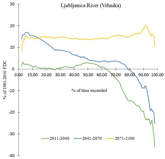 Figure 5 shows results for the low-flow investigation of the Ljubljanica River (Vrhnika station). One can notice that both MAM7 and MAM30 decrease for the periods of 2011–2040 and 2041–2070 (i.e., median value). For the last 30-years period of the 21st century, the MAM7 and MAM30 are projected to increase. This indicates that in periods with less rain, one can expect longer and more significant low-flow conditions (except for the 2071–2100 period). This conclusion is further confirmed by the Q95, which is projected to decrease in two of the three investigated 30-year periods (i.e., median case). This means that the flow duration curve shown in Figure 3 could change in the future. Based on the simulated daily flow data from the five models that were used in this study, the changes between the reference (1981–2010) and the future (2011–2040, 2041–2070, 2071–2100) flow duration curves were determined (Figure 6). A similar conclusion was also made by [], who found that Q95 could decrease by up to 20% for the south-eastern part of Austria for the 2021–2050 period compared to the 1978–2007 period. However, for the Alps, an increase in the range of 10% to 30% could be expected [].