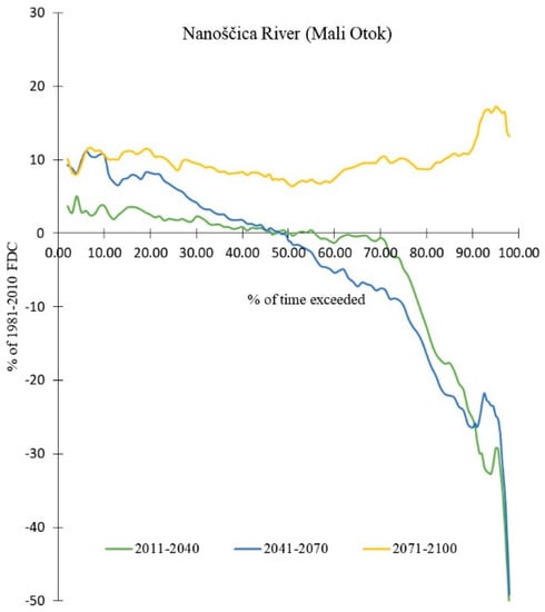 Changes in the flow duration curves for the Vrhnika gauging station confirm that based on the predictions used in this study, one could expect that the greatest changes in the hydrological cycle will be seen primarily in the decline of low-flow values, especially for the 2011–2070 period. This kind of behavior is manly driven by the precipitation decrease [] in summer months when karst rivers in a temperate continental climate often have lowest discharge values. [,] indicated that summer precipitation could decrease in the periods of 2011–2040 and 2041–2070 compared to the reference period (i.e., 1981–2010) while precipitation could increase in summer for the 2071–2100 period compared to the reference period. Thus, this leads to different FDC dynamics in the period of 2071–2100 compared to the other two periods (Figure 5). Thus, a precipitation decrease could result in a lower summer discharge value, which could influence the water abundance and vulnerability of karst rivers. However, looking at the minimum and maximum values shown in Figure 5, one can notice that low-flow characteristics could either significantly decrease (e.g., Q95 of more than 30% in the period of 2011–2040) or even increase in the future (e.g., period 2071–2100). [] stated that the total uncertainty in the Q95 for some catchments can exceed 60%.