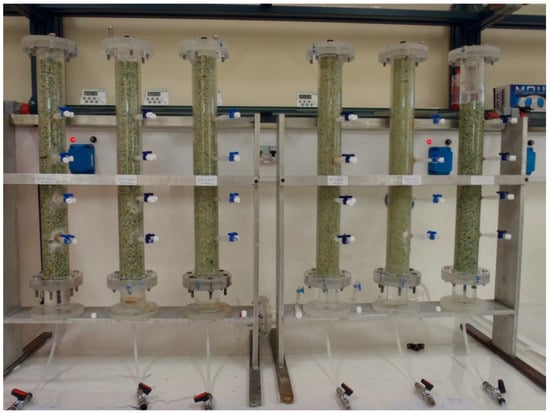 The artificial wastewater (AWW) used in the continuous flow column experiments was NH4Cl aqueous solutions using deionized water (DW). NH4Cl was dried at 104 °C for 24 h and then diluted to the desired concentration (the initial NH4+-N concentration of the AWW was 200 mg/L). The second cheese whey (SCW) used in this study was obtained from the Papathanasiou S.A. dairy (Agrinio, Greece), transported to the laboratory in plastic bottles, and then stored at −20 °C until use to prevent any change in its composition. The COD concentration of the undiluted SCW was 28.500 mg/L, total Kjeldahl nitrogen (TKN) was 243 mg/L, NH4+ was 45.27 mg/L, PO43− was 196.69 mg/L, and its pH was 4.2 [].