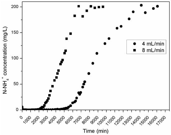 Initially, experiments were performed using artificial wastewater (AWW). Figure 3 presents the time series charts of NH4+-N concentrations in column effluents for two different flow rates (i.e., 4 mL/min and 8 mL/min). The initial NH4+-N concentration of the AWW was 200 mg/L, while column void volume was 380 mL. Zeolite proved to be rather efficient at adsorbing NH4+-N, as NH4+-N concentrations remained below 1 mg/L after 4560 min and 2000 min treatment time for the flow rates 4 mL/min and 8 mL/min, respectively. These flow rates correspond to approximately 45 bed volumes of treated AWW.