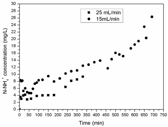 Figure 4 presents the time series charts of NH4+-N concentrations recorded in column effluent for both flow rates when columns were fed with 50% SCW. The initial concentrations of NH4+-N in the SCW were 28 mg/L and 9 mg/L for the 15 mL/min and 25 mL/min flow rates, respectively (since SCW were obtained in different seasons and at different times of the day, presenting different characteristics), and column void volume was 380 mL. Although no plateau is presented in Figure 4, zeolite was considered saturated, when the NH4+-N effluent concentrations were the same with feeding convention.