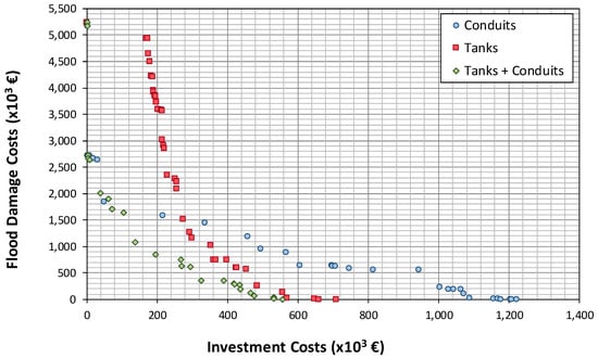 Since the damage associated with flooding depends on the probability of rainfall, a multi-objective approach is assumed. Two different cost functions will be defined: investment costs for pipes and tanks, and damage costs associated with the flood itself. A multi-objective optimization algorithm was built linking an adapted Non-dominated Sorting Genetic Algorithm (NSGA-II) [32] with a SWMM programmer toolkit [33] to perform the rehabilitation of drainage networks by combining the use of pipe substitutions and the installation of storage tanks. Flooding damages are quantified in term of money based on the water level of the flood. As a result, a set of Pareto fronts were obtained relating both types of costs. These solutions can be used by network managers to make decisions concerning the rehabilitation plans and investments within the context of budget limitations.