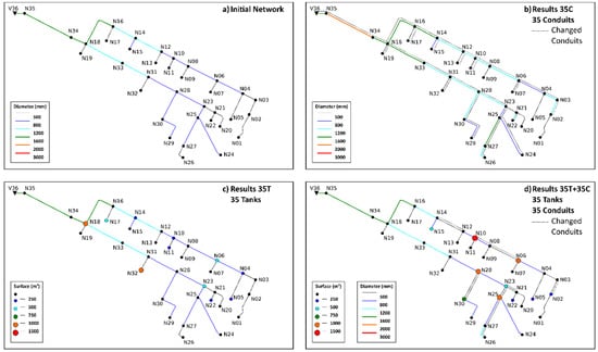 The NSGA-II presents a set of feasible solutions instead of a single one. This way, the decision about the best solution depends on several factors, i.e., budget availability, risk level, administrative regulations, etc. This is the reason why the multi-objective algorithm was selected. As an example, the solution for the case of unlimited budget availability is presented. If there are no investment limitations, the solution will look for a scenario with no flooding. This scenario corresponds to the horizontal axis of Figure 5. The solution for zero flooding needs an investment of either 1,213,453€ in pipe renewal or 719,366€ in storage units. In accordance with the methodology presented in this paper, the problem can be solved with a joint investment of 517,559€. Solutions in terms of the volume of detention tanks and the diameters of pipes are shown in Figure 6. Pipes marked with dashed lines represent changed pipes with respect to the original network.
