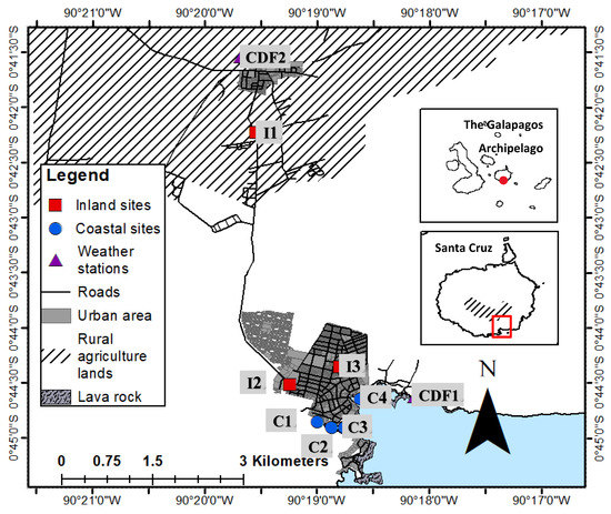 Pelican Bay Watershed: Urban, Rural and Agricultural Areas, Two Weather Stations (purple triangle), Four Coastal Sites (blue circle) and Three Inland Sites (red square). Coastal sites are: Las Ninfas Lagoon (C1), Academy Bay in (C2), Academy Bay out (C3) and Muelle de los Pescadores (C4). Inland sites are: Pozo Profundo (I1), INGALA (I2), Misión San Francisco (I3). CDF1 and CDF2 represent the Charles Darwin Foundation weather stations located in the Charles Darwin Research Station and Bellavista, respectively. Top inset: Galapagos Archipelago. Bottom inset: Santa Cruz Island.