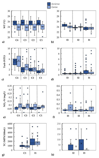 Data variability within invierno and garúa seasons differed for each parameter suggesting that some of them may be influenced by seasons. While WT, EC, Sal, Turb, NO3−-N, TC, and FC present seasonal variations (Figure 2), DO, pH, TP, and NO2−-N did not show any important differences between seasons (Figure A3). In general, higher variation happened during the garúa season relative to the invierno season with the exception of TC and FC in which higher variability happened during invierno. Results for WT, Turb, NO3−-N, and TC are shown in Figure 2, and results for EC, Sal, and FC are presented in Figure A4.