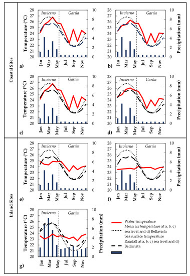 Seasonal analysis shows that coastal WT variability is consistent with seasonal changes, where higher WT concurred with the hot invierno season and the lower temperatures fell during the garúa season (Figure 3). However, differences between WT observations and measurements of air and sea surface temperatures from the Charles Darwin Foundation (CDF) stations were observed within study sites. Water temperature at coastal sites (Figure 3a–d) behaved similar to air and sea surface temperature between January to May. However, it appears to be one month lag between high peaks for air temperature and coastal water temperature. High peak for air temperature is in March whereas high peak for coastal water is in April. From September through December, a steep rise of WT would be expected according to the seasonal variation seen for air and sea surface temperature; however, the high temperature in September compared to the neighboring months breaks this pattern since unusual high water temperature were reported for this month at many years of the study period. Water temperature regime at inland sites (Figure 3e–g) presented a weaker seasonal variation (also seen in Figure 2b) and only I3 which is Misión San Francisco (Figure 3e) seems to receive seasonal influence that affects its temperature. Periodic annual fluctuation of these inland sites has a noticeable amplitude less than 1 °C.