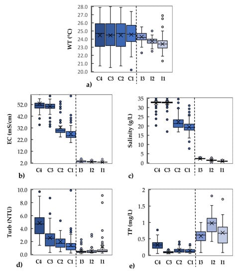 Spatial variation for (a) WT, (b) EC, (c) Sal, (d) Turb, and (e) TP. Study sites are ordered by proximity to the sea, being C2 the closest to the sea and I2 the furthest. The upper and lower quartiles are represented by the ends of the box, the median is the horizontal line between box ends, the mean is marked by “x”, the whiskers indicate variability outside the upper and lower quartiles and, finally, points outside whiskers are considered as outliers.