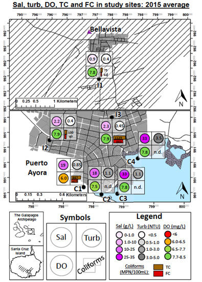 Analyses employed a 9-year (2007–2015) dataset obtained from the routine water quality monitoring program carried out by the Galapagos National Park in Santa Cruz Island to monitor the overall status of inland and coastal waters [30]. Data consisted in a total of 11 water quality parameters presented in Table A1: electrical conductivity (EC), salinity (Sal), dissolved oxygen (DO), water temperature (WT), pH, turbidity (Turb), fecal coliforms (FC), total coliforms (TC), nitrite (NO2−-N), nitrate (NO3−-N), and total phosphorus (TP).