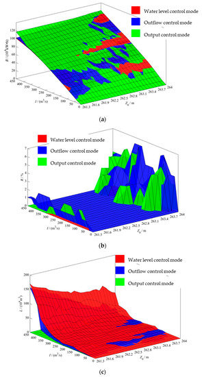 Figure 2c is a comparison of discarded water quantity. It can be seen that when the inflow increases from 400 m3/s to 450 m3/s, there is a surge in discarded water quantity because the Xiaoxuan hydropower station cannot completely utilize the inflow water quantity, which leads to a sharp decrease in power generation benefits. Among the three control modes, the red surface is much higher than the other two surfaces, with the green one at the bottom. In other words, under most operating conditions, the water level control mode produces the largest amount of discarded water, followed by the outflow control mode and then the output control mode. It can be explained by the following reasons. Under the water level control mode, if the actual inflow is too large, there may still be discarded water even when the generator sets run at full capacity, and this situation will intensify with the increase of the excessive inflow. Under the outflow control mode, to avoid the beyond-upper-limit risk as the water level keeps rising, the reservoir may produce the second-type discarded water (which is not as planned). Also, there may be the first-type discarded water as the actual dynamic characteristics of the generator sets deviate from the optimal operation scheme. By contrast, the output control mode produces the least discarded water because on the one hand, the outflow process is derived from the output process and there is no extra first-type discarded water except for that originally in the operation scheme; on the other hand, only under extreme conditions will the beyond-limit risk arise and the second-type discarded water be produced.