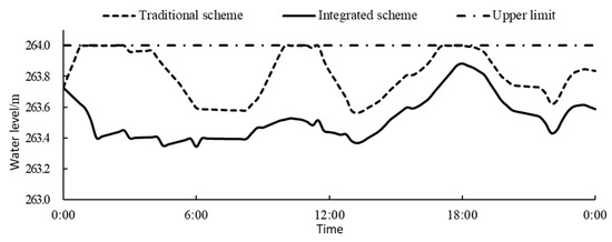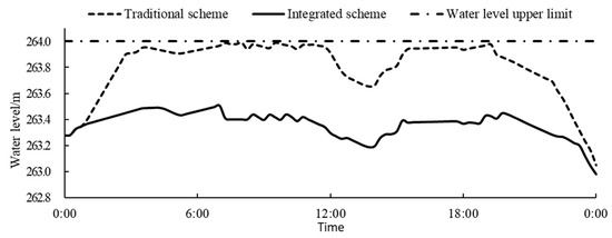 The calculation results of the second operating condition are shown in Table 3 and Figure 5. Given a relatively high initial water level and large inflow, in the traditional scheme, the water level exceeds the upper limit three times, which undermines the safe and stable operation of the reservoir and causes some second-type discarded water. On account of the benefit loss from discarded water, the traditional scheme produces lower power generation benefits even with a higher water level than the integrated scheme. By comparison, the integrated scheme operates the reservoir around the upper warning water level in the first half of the day, where the productive head is relatively low, but 0.5 m of storage capacity is reserved. In the second half of the day when the inflow increases sharply, the reservoir can absorb this surge of water and convert it into electric energy, which leads to fewer losses from discarded water and thus higher power generation benefits than the traditional scheme.