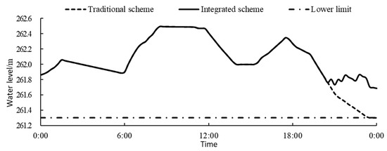 The calculation results of the third operating condition are shown in Table 4 and Figure 6. When the predicted inflow is too large, in the traditional scheme the overall power output is too high. The reservoir water level may be lower than expected (especially when it is already low at the beginning) and easily fall below the lower limit. As is shown in Figure 6, between 23:30 and 24:00 the reservoir water level in the traditional scheme is below the lower limit, which cannot meet the demand of ecological flow and may bring about damage to the downstream ecological environment. Besides, due to the lack of water in these two periods, the generator sets are forced to shut down, which severely disrupts the power generation process and results in lower benefits. In the integrated scheme, the water level before 20:30 is the same as the traditional scheme. At 20:30, the water level is at 261.76 m, which is below the lower warning level. Afterward, the integrated scheme is revised by the operation rules to reduce the power output, which effectively prevents the water level from exceeding the lower limit and enhances the power generation benefits.