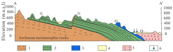 The geological cross map of the Jinan karst spring system. (1. Archaean metamorphic rocks; 2. Cambrian limestone; 3. Ordovician limestone; 4. Quaternary sediments; 5. Magmatic rocks; and 6. Spring).