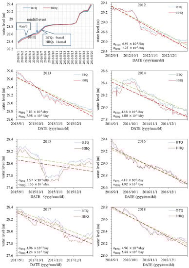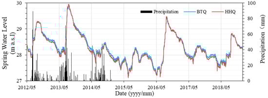 The water level of BTQ and HHQ have a similar seasonal trend, with the highest water level in September and the lowest water level in July. However, there are also some differences between the water level of BTQ and HHQ. In the years of 2012, 2013, 2016, and 2018, the water level of BTQ is around 5 cm higher than the water level of HHQ in the dry season, while 5–15 cm lower than HHQ in the wet season. Similar spring water level behaviors are also observed in the year of 2010 and 2011, when the water level in BTQ is 3–4 cm higher than the water level in HHQ in the dry season, and 5 cm lower than that of HHQ in the wet season []. In the years of 2014, 2015, and 2017, the water level of BTQ is higher than the level of HHQ for both the wet and dry seasons.