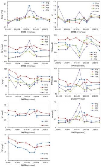 The concentration of HCO3− ranged from 241.7 mg/L to 307.2 mg/L for BTQ, from 282.4 mg/L to 316.2 mg/L for HHQ, from 223.4 mg/L to 333.2 mg/L for WLT, and from 213.6 mg/L to 279.1 mg/L for ZZQ. There were valleys in the time series of HCO3− concentration on 19 June in BTQ, WLT, and ZZQ, while this concentration valley did not show in HHQ (Figure 4).