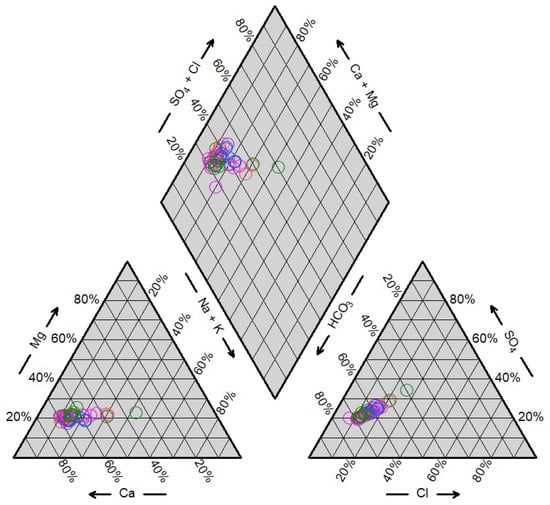 The Piper Diagram of spring water samples. (The red circle is for Baotu Spring, the blue circle is for Heihu Spring, the violet circle is for Wulong Spring, and the green circle is for Zhenzhu Spring).