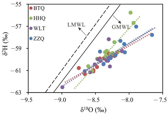 The relationship of δ18O and δ2H in spring samples from BTQ, HHQ, WLT, and ZZQ.