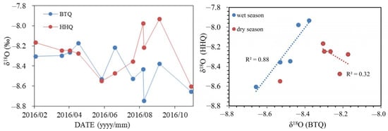 The temporal variation of δ18O values in springs and the relationship of δ18O values in BTQ and HHQ.