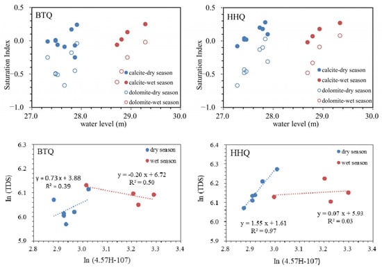 The relationship between water level and saturation index of calcite and dolomite and the relationship between and water level with TDS (total dissolved solutions) in BTQ and HHQ.