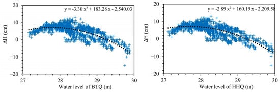 The water level difference (ΔH) is defined as the water level of the Baotu Spring minus the water level of the Heihu Spring. From Figure 10, the distribution of the water level difference (ΔH) against the water level of BTQ/HHQ is arc-shaped. The maximum water level difference occurs at the water level of 27.9 m and zero water level difference occurs at water level of 29 m. Given the zero outflow elevation of BTQ and HHQ is 27 m, three conditions are obtained: